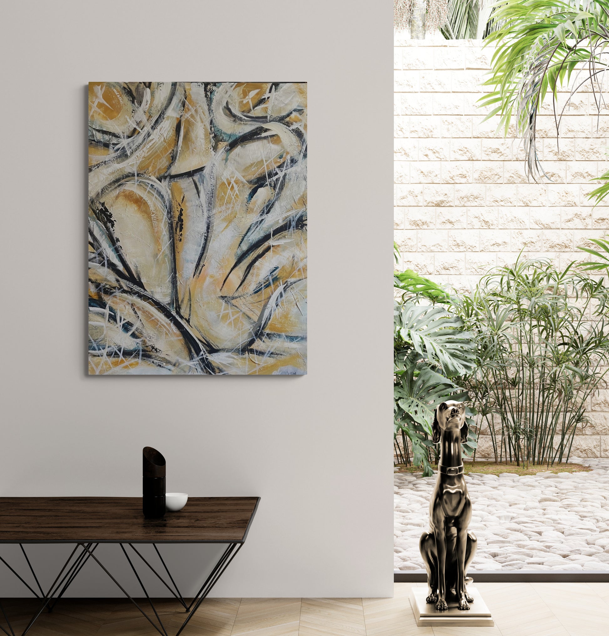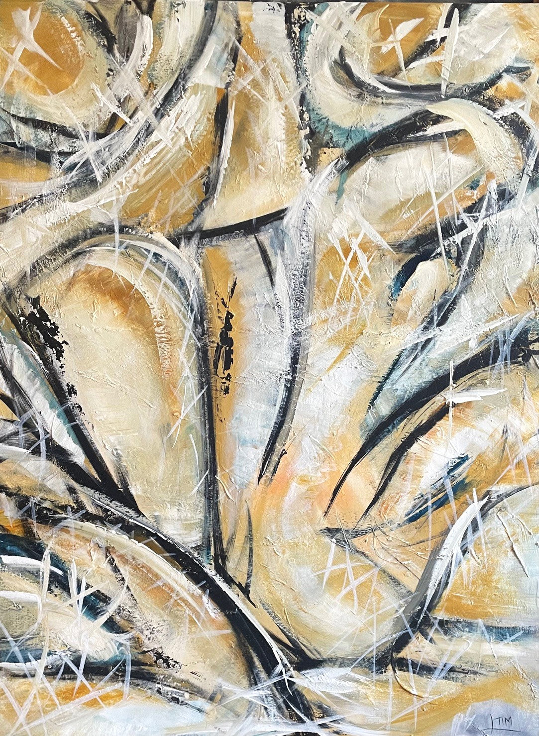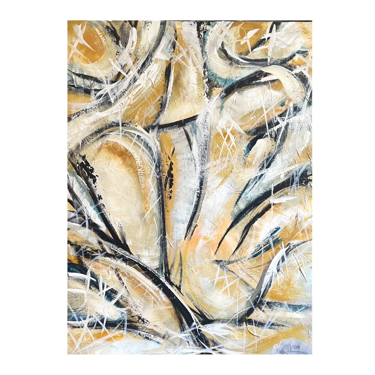 Jungle Mood embodies layers of colour blended on a textured surface. A soothing, calm artwork. Evokes a 'tigerish' feel with tones of ochre bordered by black brush strokes and overlayed with white streaks.
