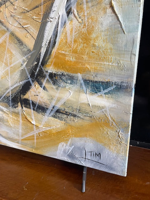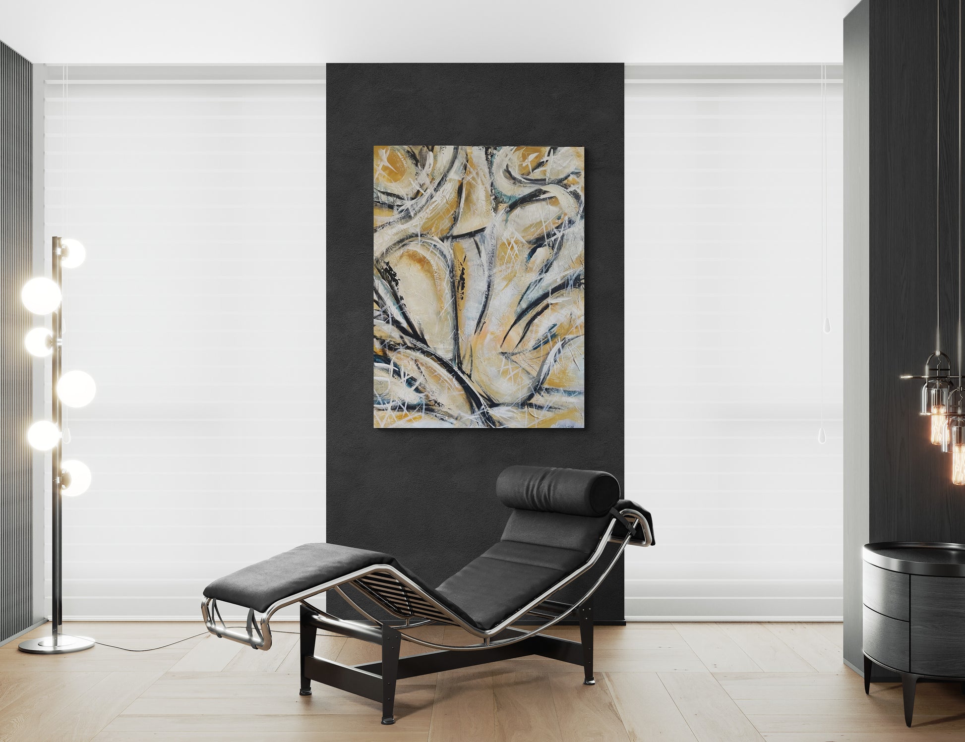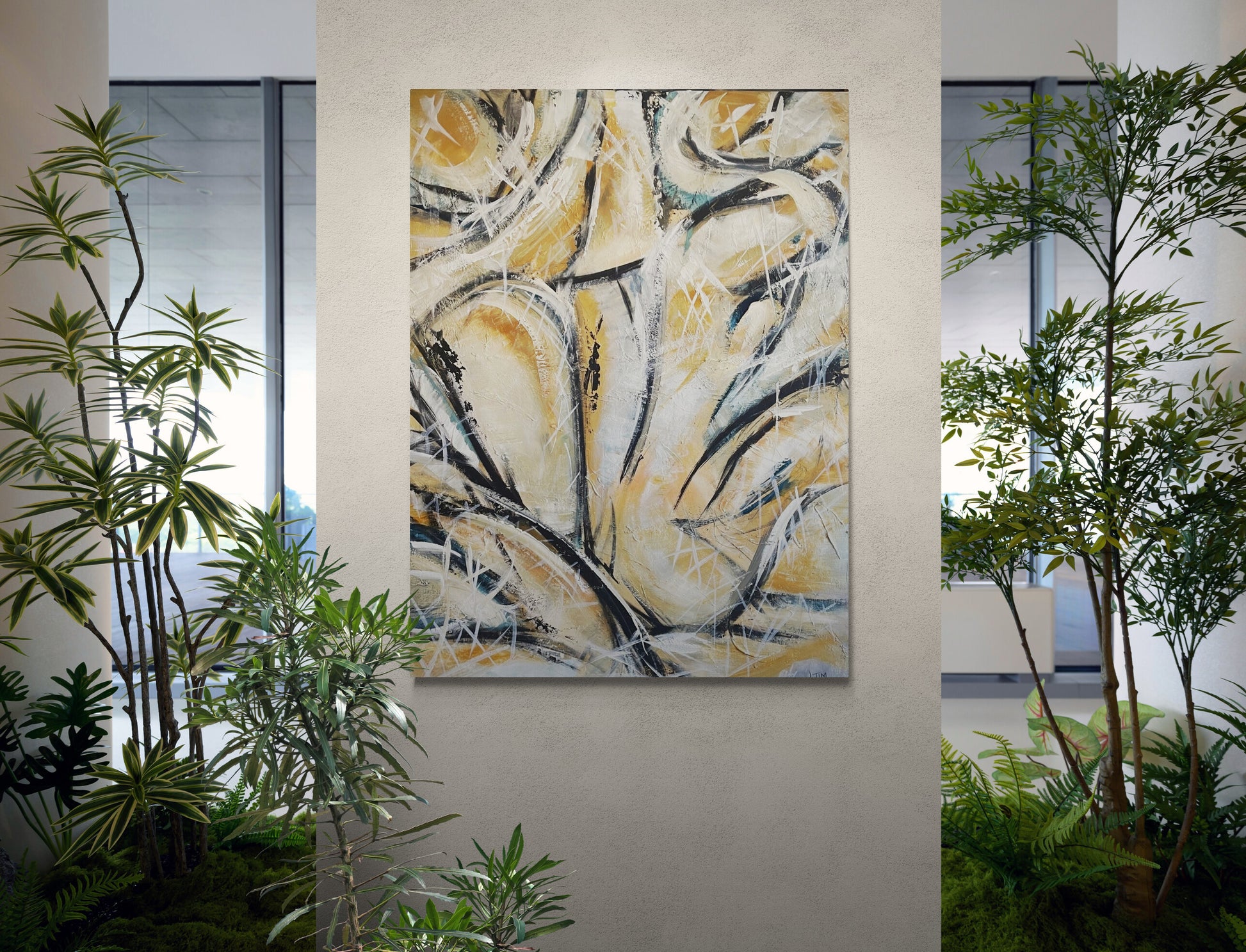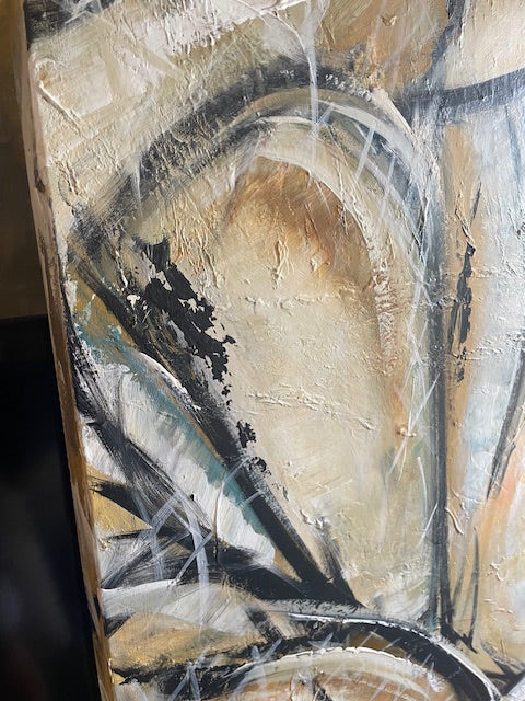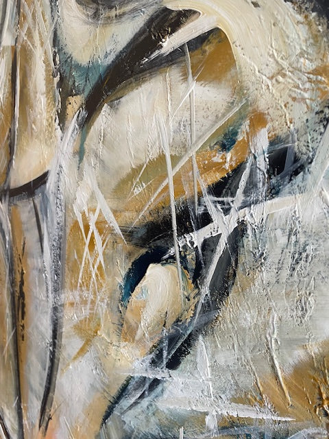 Jungle Mood embodies layers of colour blended on a textured surface. A soothing, calm artwork. Evokes a 'tigerish' feel with tones of ochre bordered by black brush strokes and overlayed with white streaks.