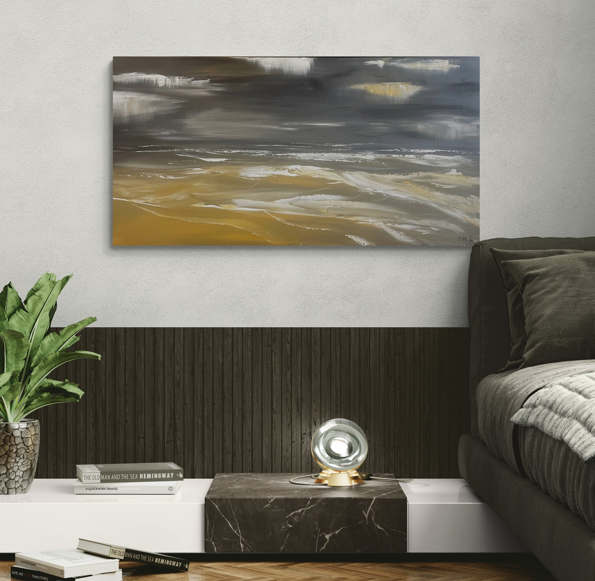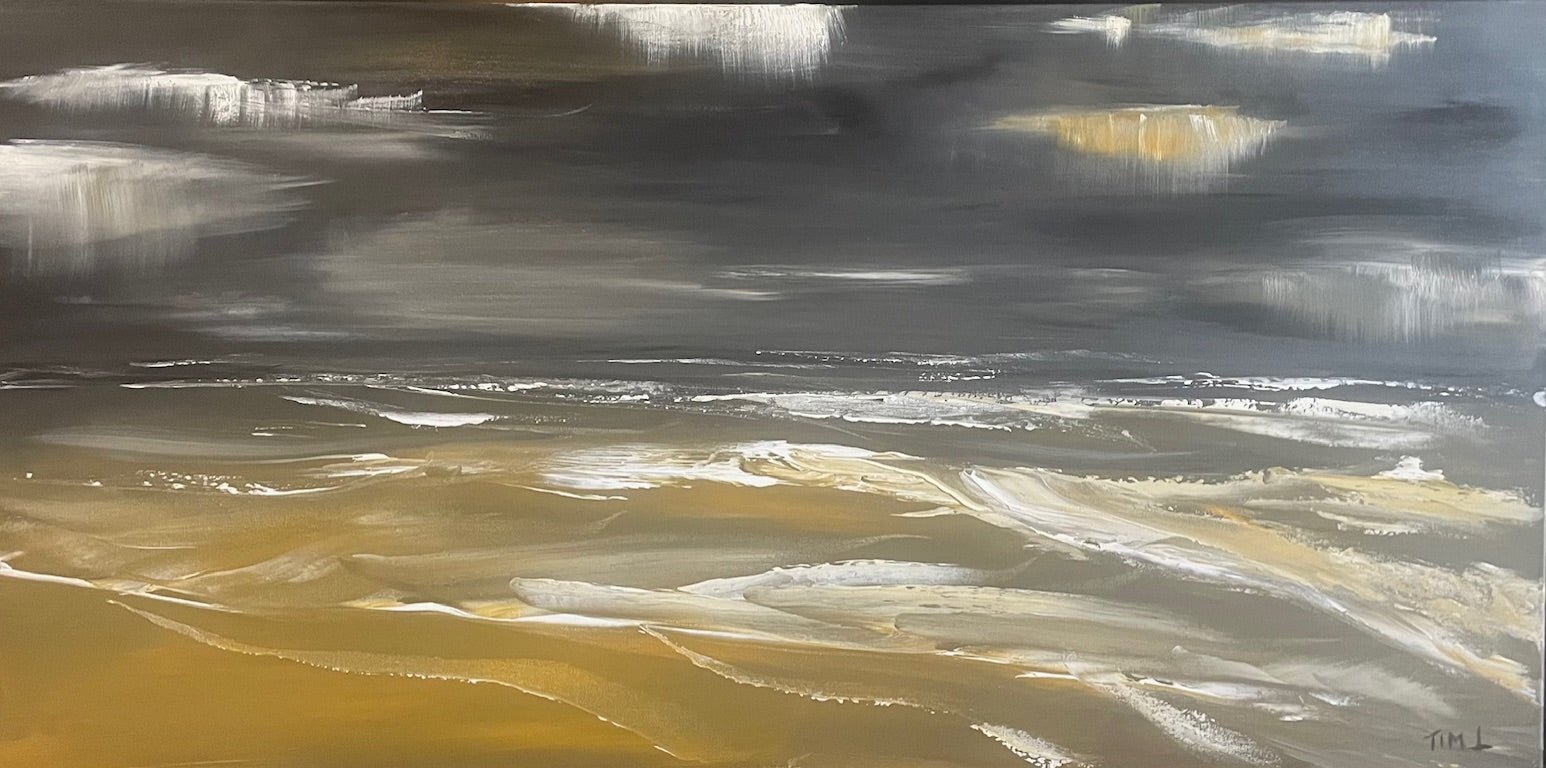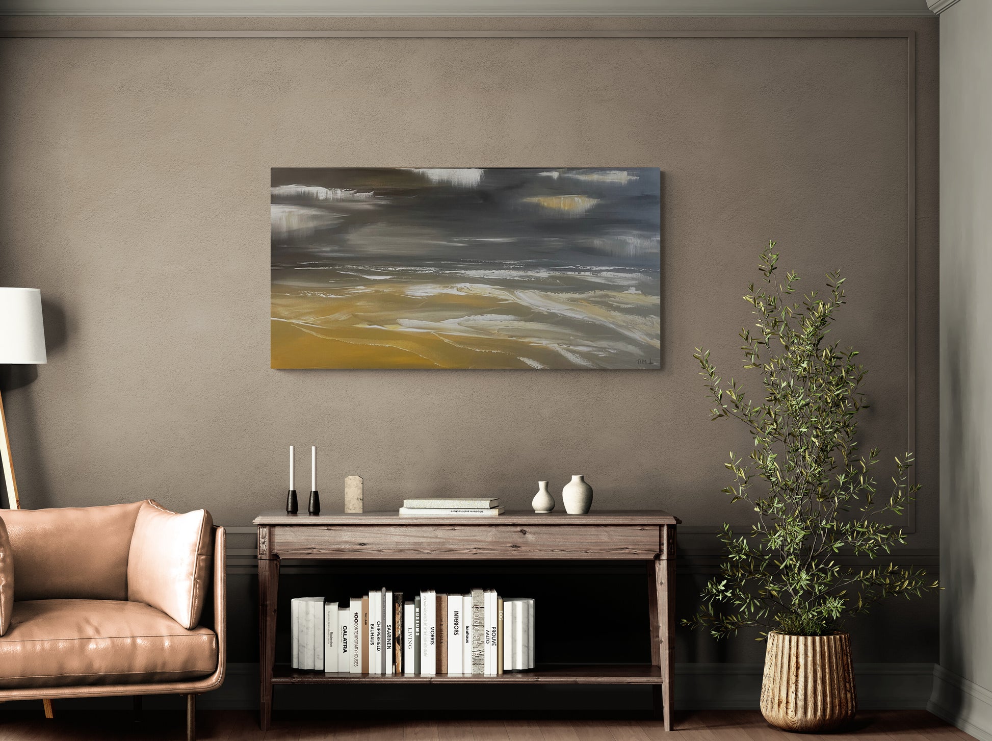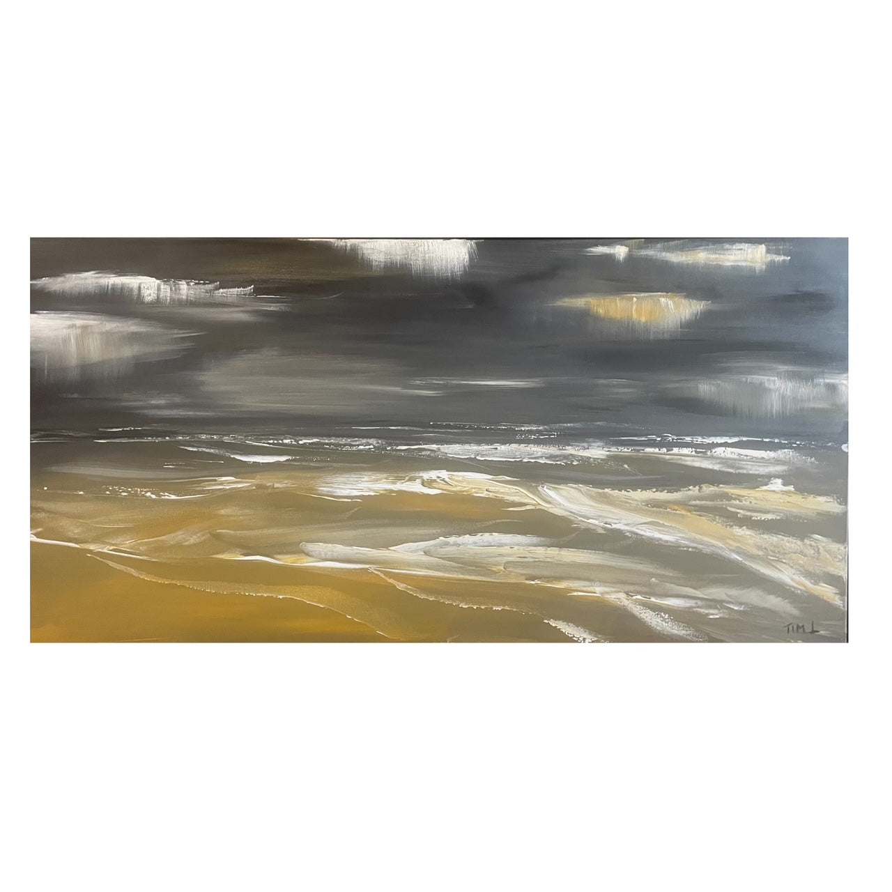 Ochre, black,greys blends and scraped colours create ocean night mood. Waves meet the shoreline.